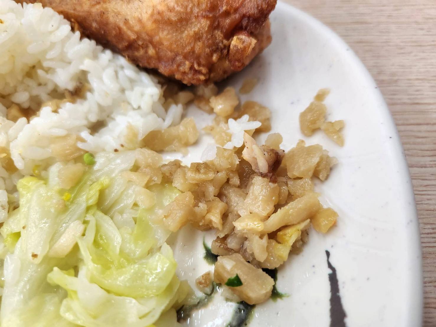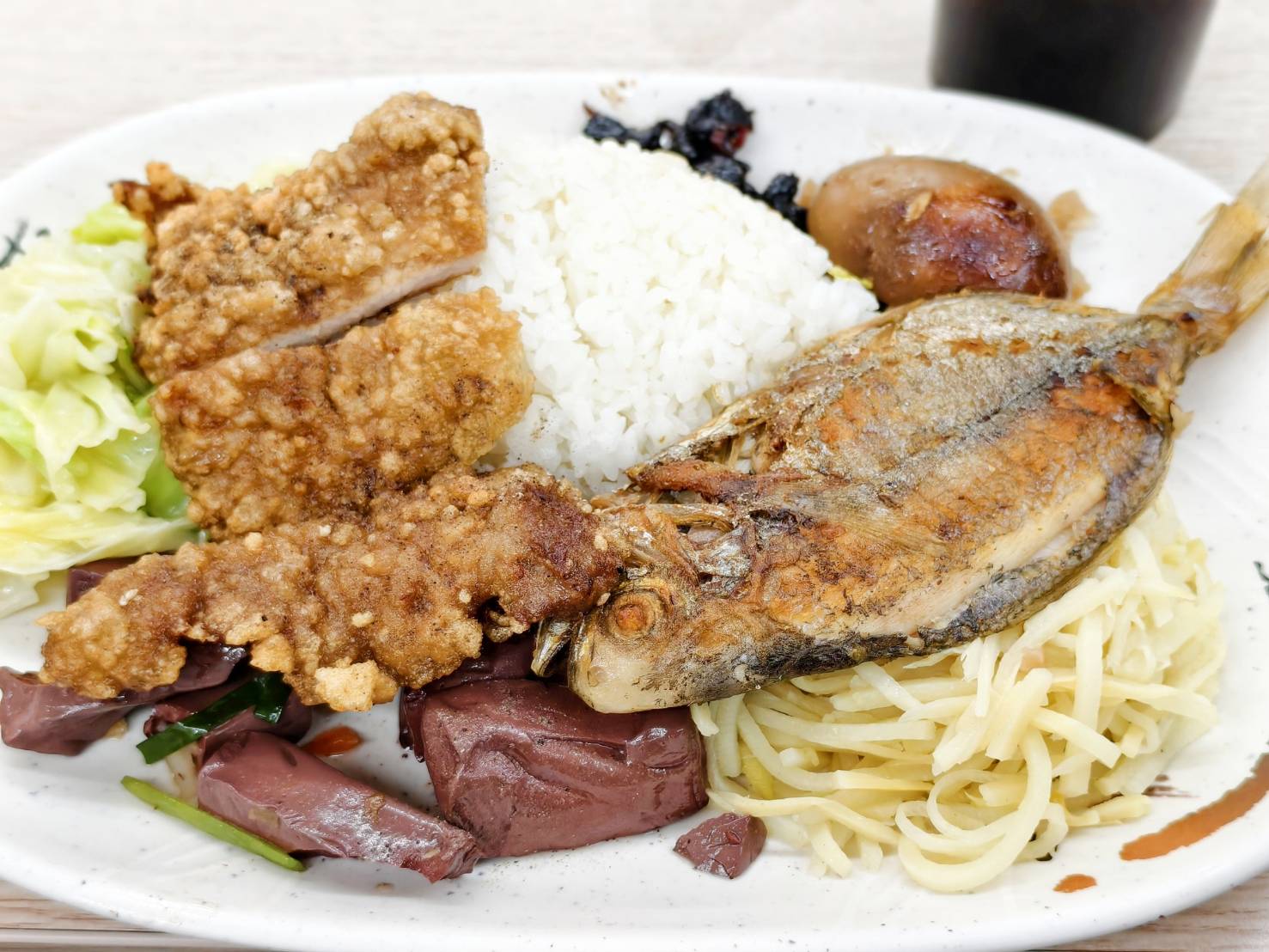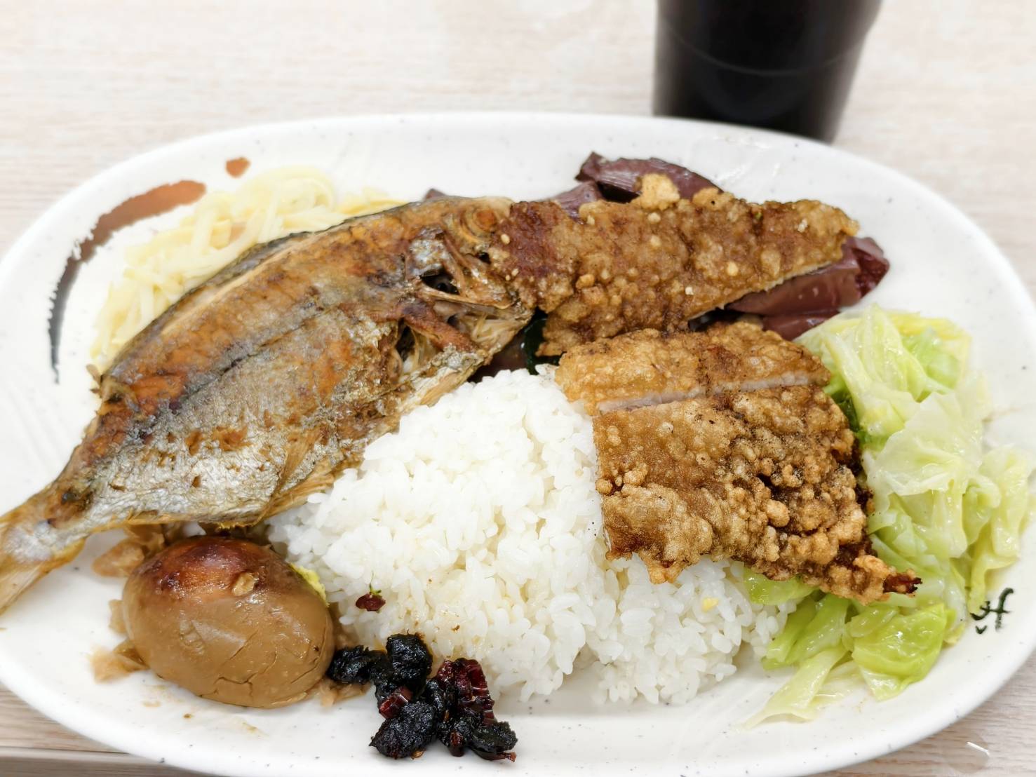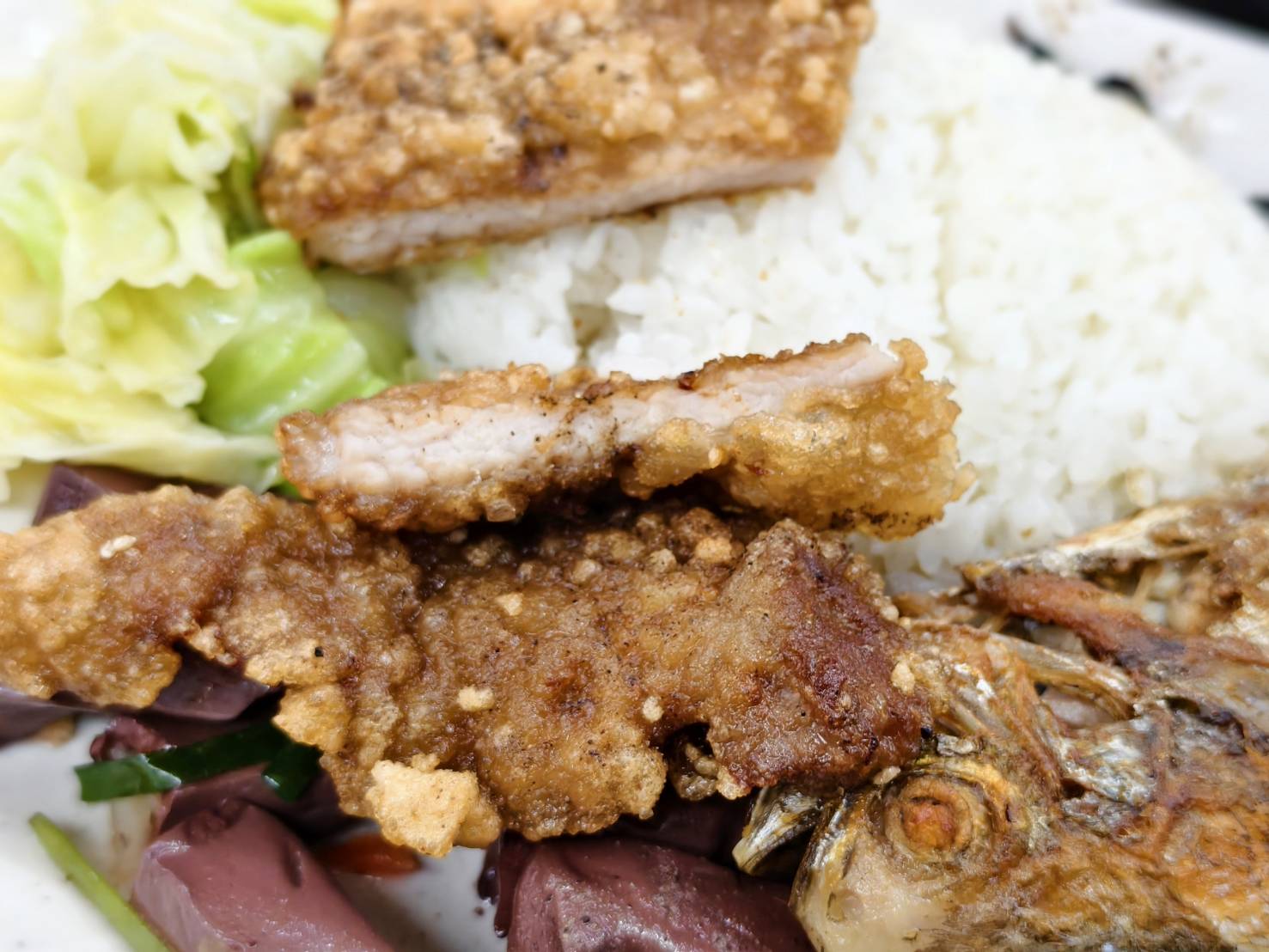 排骨雞腿魚肉不油膩、白飯粒粒分明,配菜份量不少,配菜味微淡,加上菜脯辣豆豉,對味下飯剛剛好。