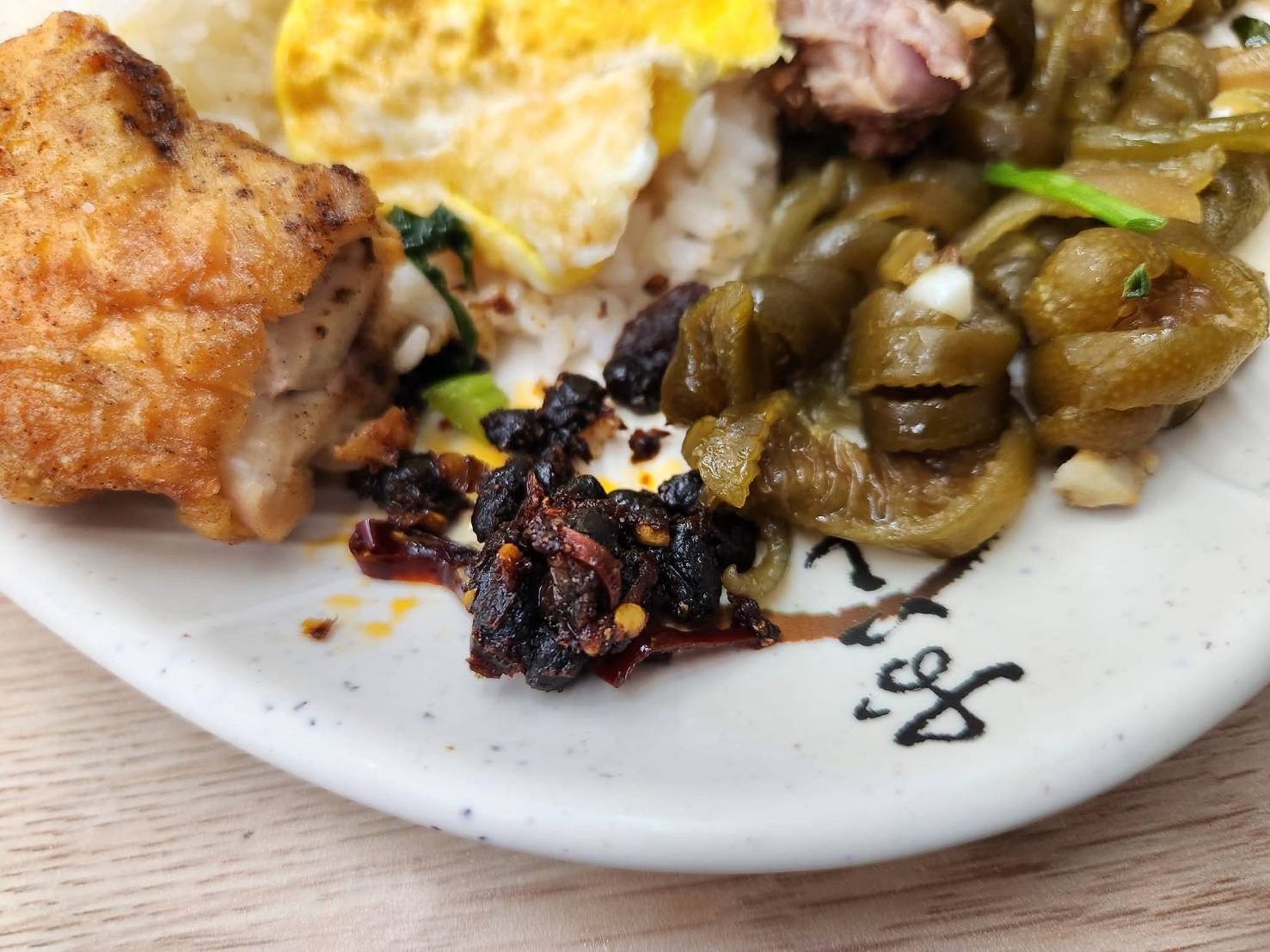 任選三種配菜,滷蛋半個,排骨半塊,就是招牌飯85元,白飯正常量,千萬要記得辣豆鼓,辣度不明顯但很下飯
