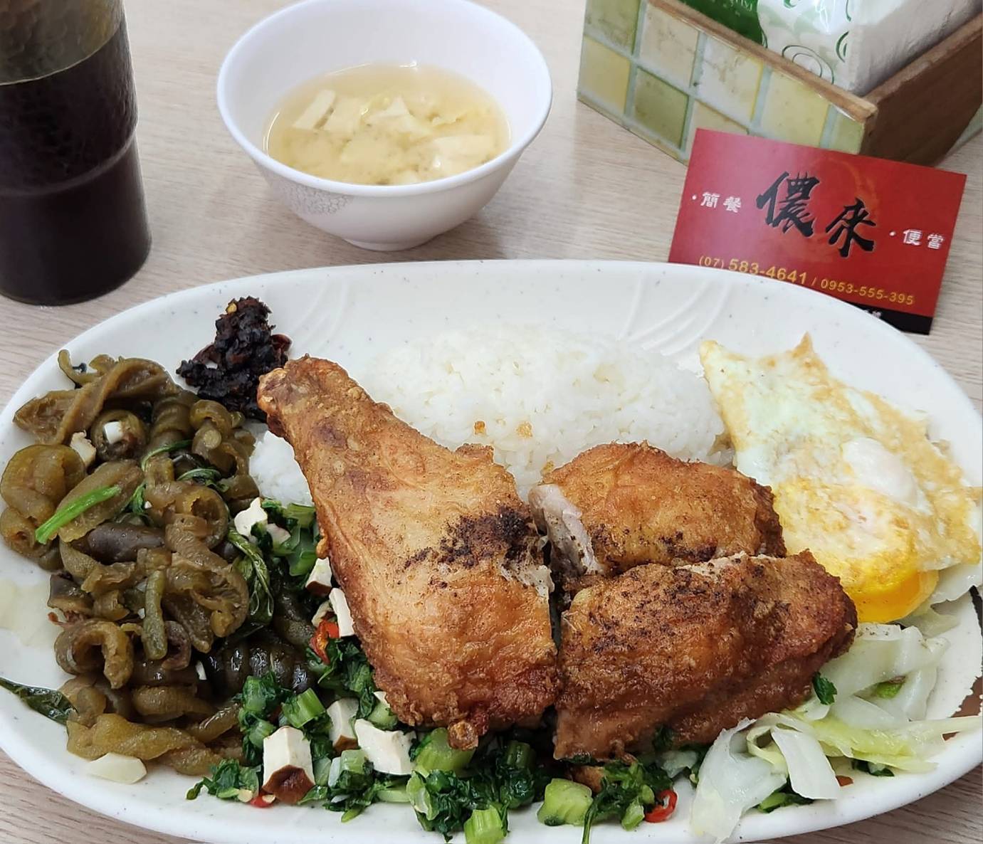 儂來簡餐便當,左營30年老店,必推薦的巷弄美食,便當可以任挑三樣菜一顆蛋,可選荷包蛋或滷蛋(招牌飯除外),還會詢問要不要淋肉燥。 除了免費紫菜蛋花湯,還有冰涼好喝的紅茶,能再續!