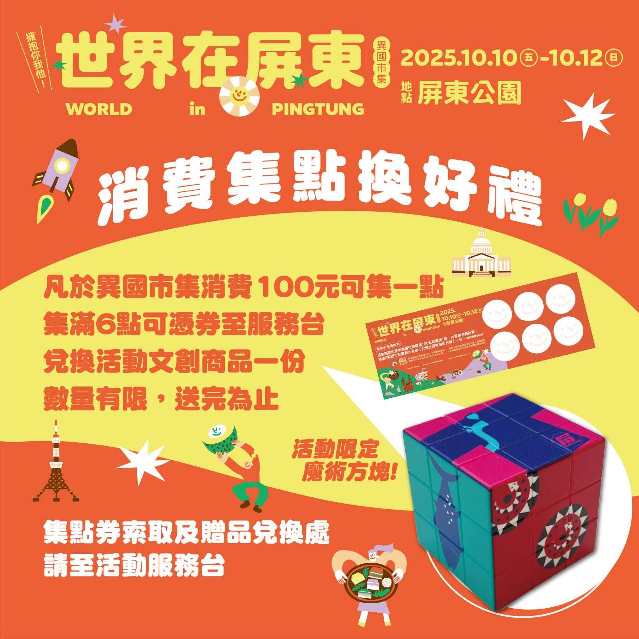 只要現場消費100元可集1點,集滿6點,就能免費兌換超酷的屏東特色魔術方塊,數量有限,兌完為止